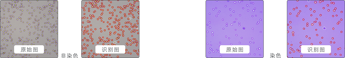 非染色計(jì)數(shù)(發(fā)明專利號(hào):ZL 201310101403.0):無(wú)需染色,直接對(duì)細(xì)胞進(jìn)行計(jì)數(shù)和區(qū)分活死細(xì)胞,適用于狀態(tài)良好、背景干凈的培養(yǎng)細(xì)胞;臺(tái)盼藍(lán)染色計(jì)數(shù):區(qū)分活細(xì)胞和死細(xì)胞的經(jīng)典方法,相比非染色法,色彩變化更直觀。