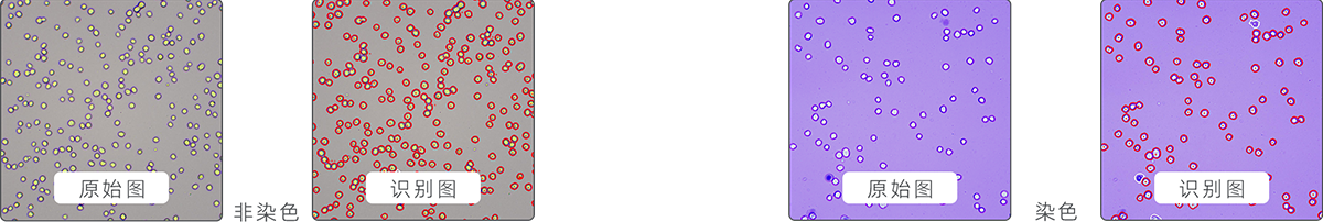 非染色計(jì)數(shù)(發(fā)明專利號(hào):ZL 201310101403.0):無(wú)需染色,直接對(duì)細(xì)胞進(jìn)行計(jì)數(shù)和區(qū)分活死細(xì)胞,適用于狀態(tài)良好、背景干凈的培養(yǎng)細(xì)胞;臺(tái)盼藍(lán)染色計(jì)數(shù):區(qū)分活細(xì)胞和死細(xì)胞的經(jīng)典方法,相比非染色法,色彩變化更直觀。