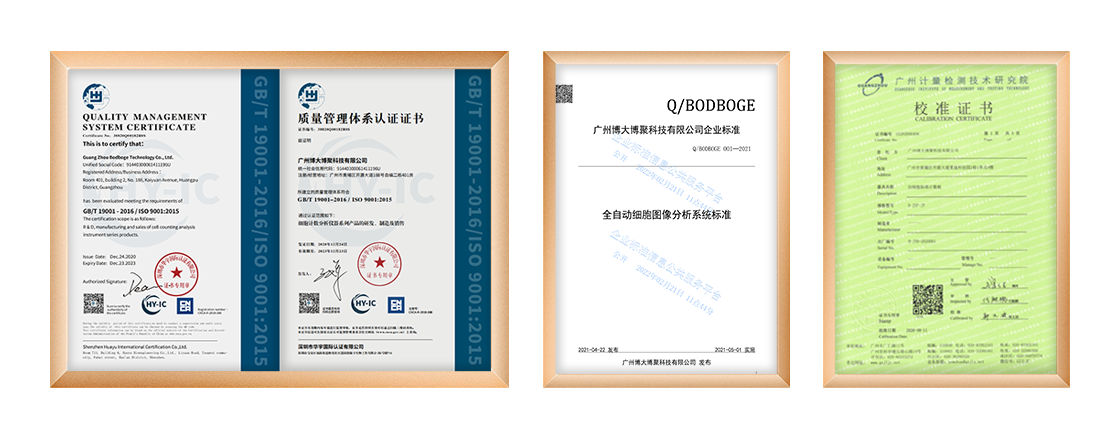 為確保博大博聚研發的細胞計數儀器的精準度,我們將專利技術轉化為計量工具(獲計量認證)—“仿細胞標準計數板”。“仿細胞標準計數板”應用于博大博聚細胞計數分析產品檢測環節,對儀器的精準度進行校準,確保每一臺出廠儀器都精確無誤,為用戶提供可靠的檢測保障。