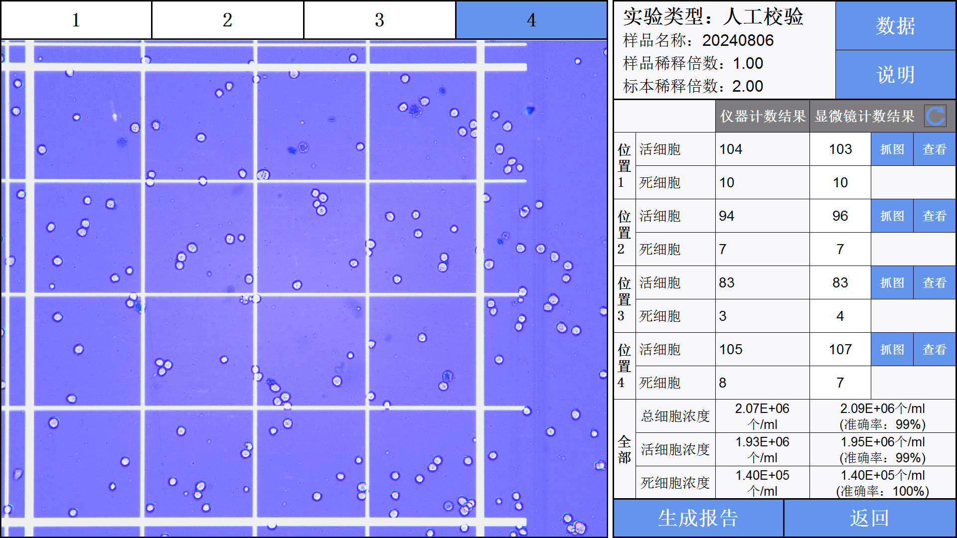 2-儀器計數完成,將血細胞計數板從儀器的載物臺中取出,放置在第三方顯微鏡下,對同一孔位樣品進行人工計數,將人工顯微鏡下的計數結果輸入儀器人工校驗界面的表格中,即可得出儀器的準確率。